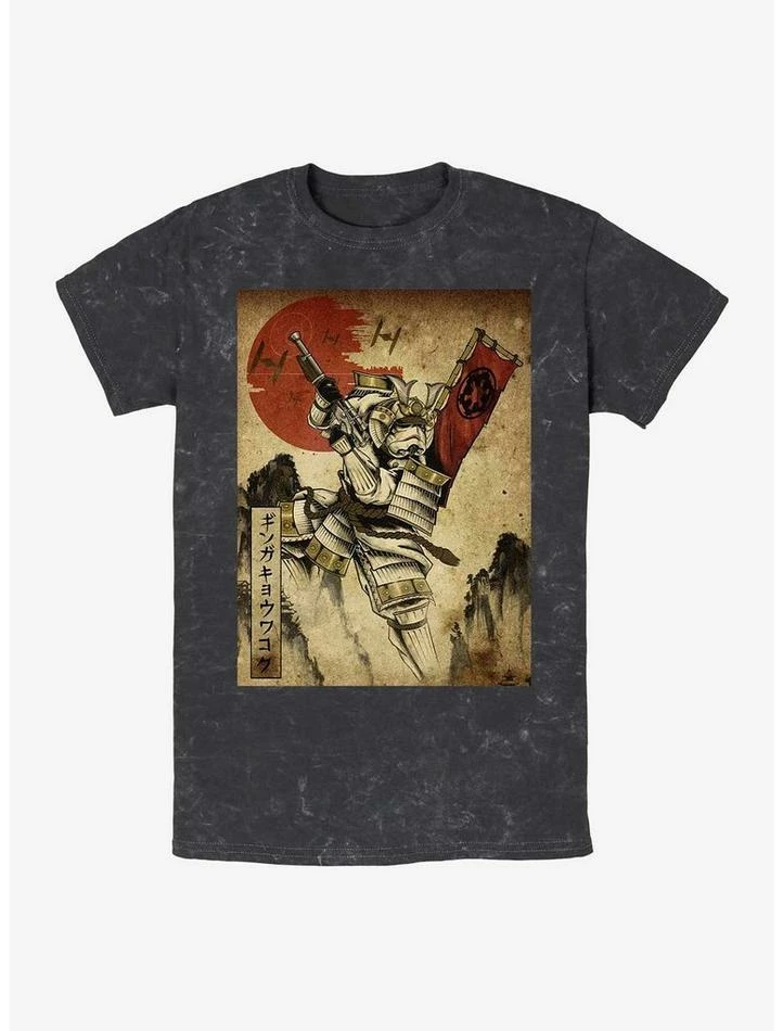 Feudal Japan meets a galaxy far, far away. This black mineral washed Star Wars tee features an image of an Ashigaru Stormtrooper.