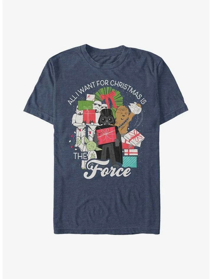 The Force comes home for the holidays! This heathered navy blue Star Wars tee features Darth Vader, Chewbacca, Yoda and Stormtroopers participating in one out-of-this-world gift exchange.