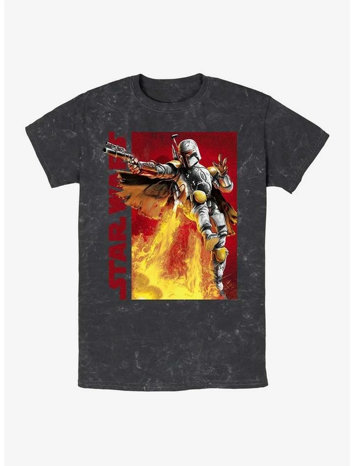This is how a bounty hunter bounces. Our black mineral washed Star Wars tee features Boba Fett blasting off.