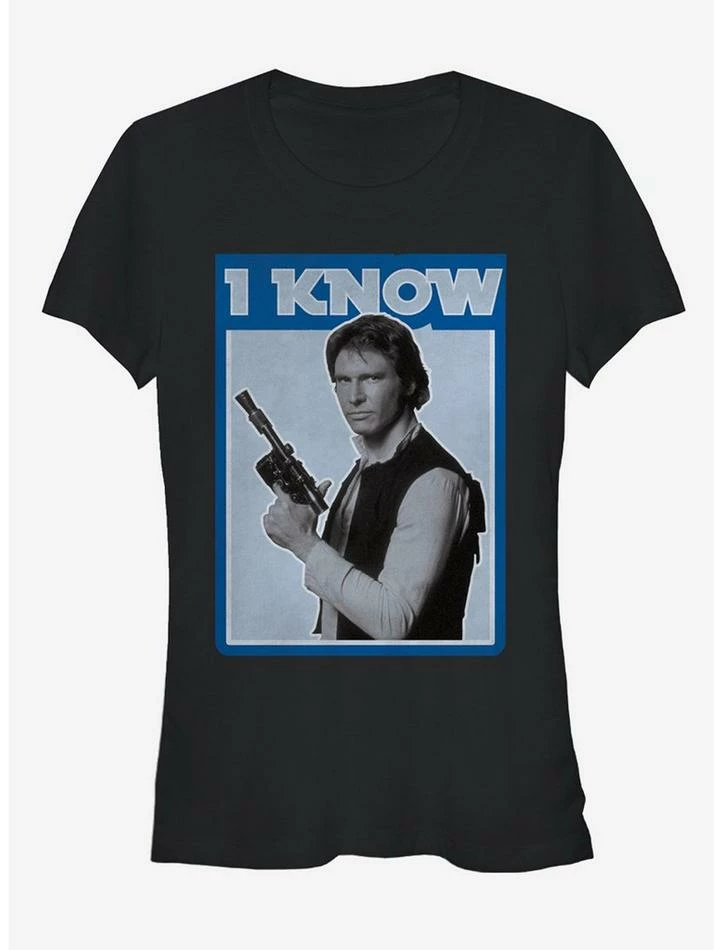 I love you. I know. Diehard Star Wars fans will instantly recognize the reference on the Star Wars Han Solo Quote I Know Black T-Shirt. This cool black Han Solo t-shirt celebrates the epic interaction between Han Solo and Princess Leia that comes moments before Solo is frozen in carbonite. 100% Cotton.