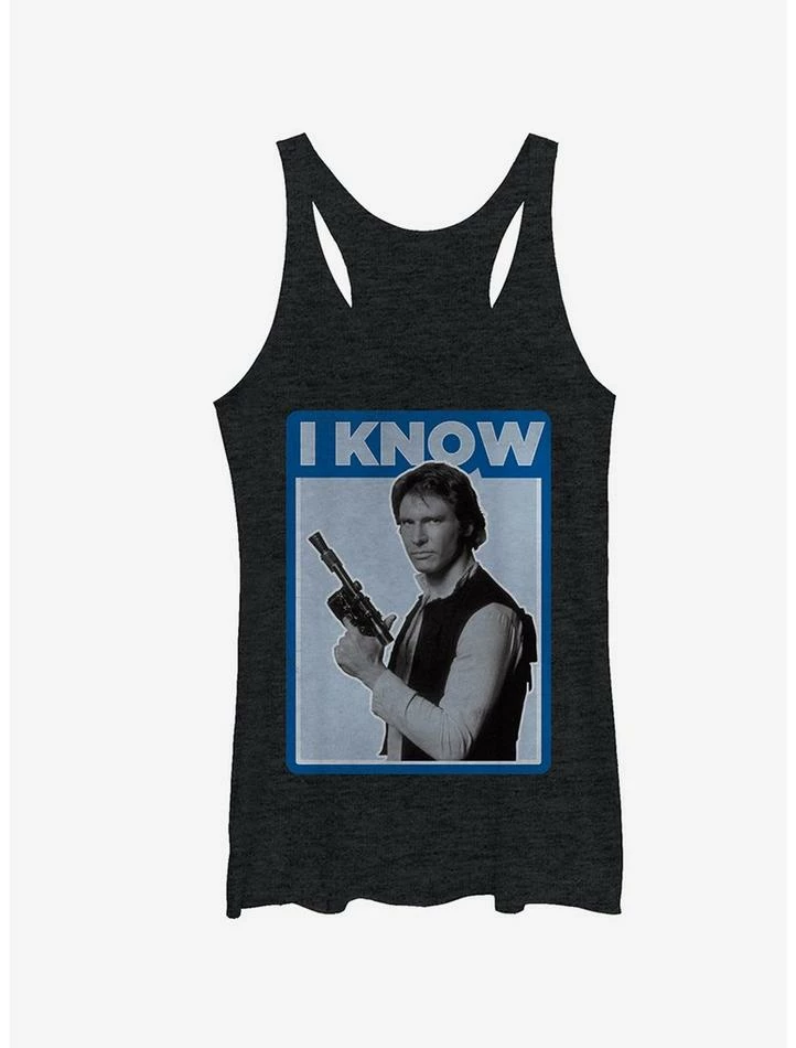 I love you. I know. Diehard Star Wars fans will instantly recognize the reference on the Star Wars Han Solo Quote I Know Heather Black Racerback Tank Top. This cool black Han Solo shirt celebrates the epic interaction between Han Solo and Princess Leia that comes moments before Solo is frozen in carbonite. 50% Polyester, 25% Cotton, 25% Rayon.