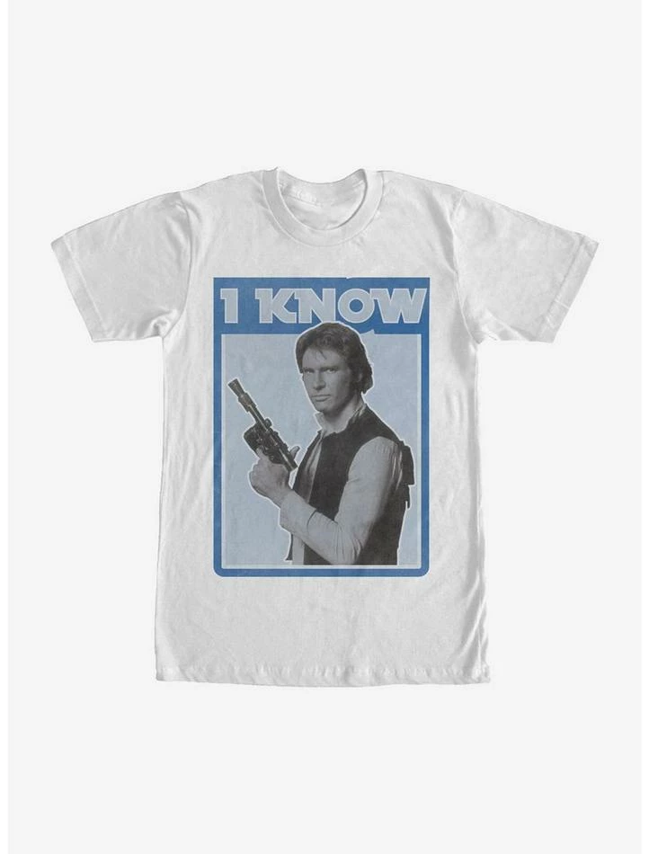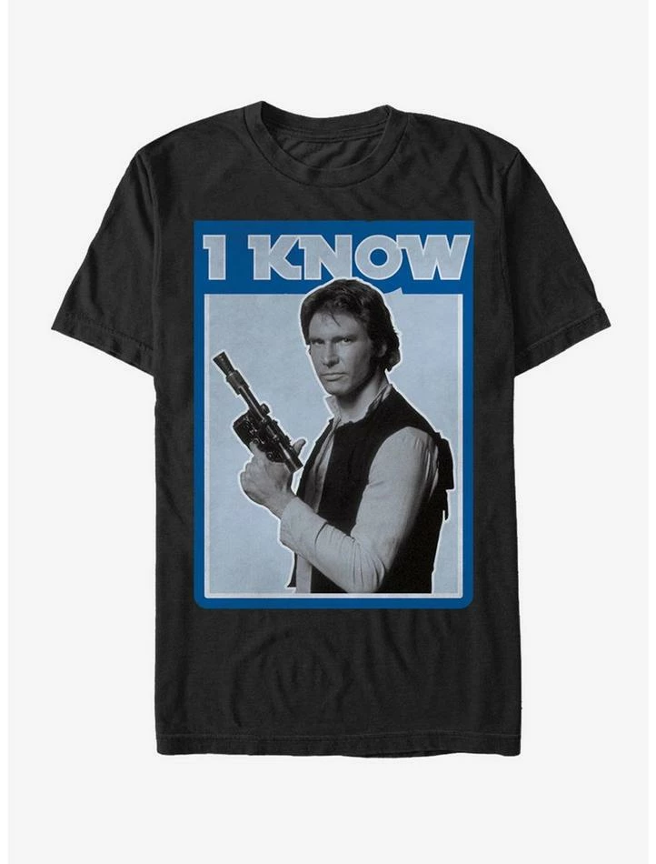 I love you. I know. Diehard Star Wars fans will instantly recognize the reference on this tee. Our cool black Han Solo shirt celebrates the epic interaction between Han Solo and Princess Leia that comes moments before Solo is frozen in carbonite.ย