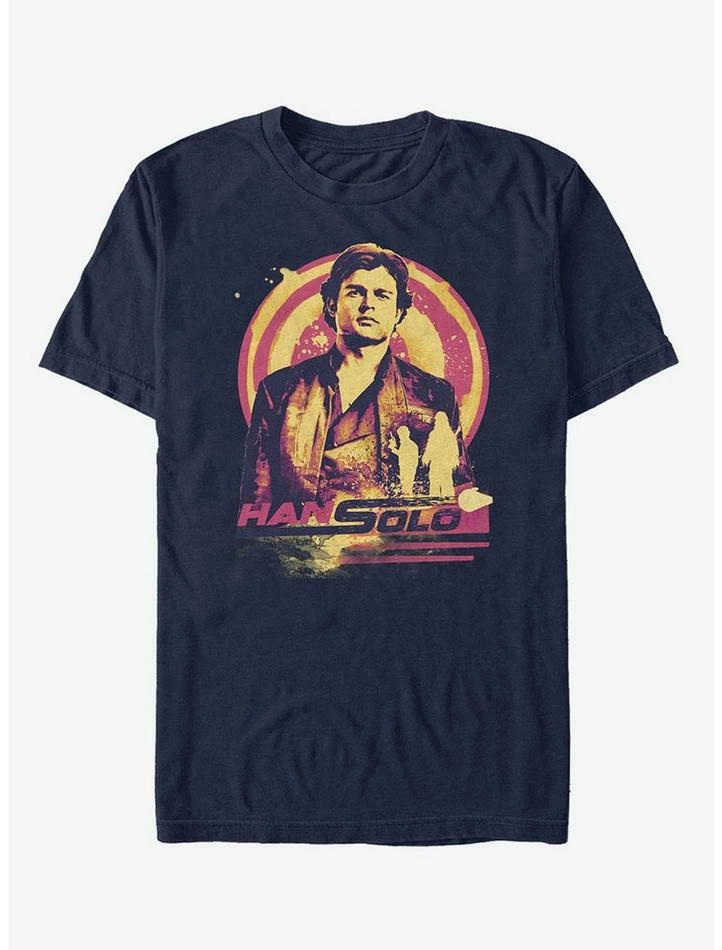 He may be a scruffy-looking nerf herder, but he always has the coolest outfits like the Solo: A Star Wars Han Sunset Men’s T-Shirt! This fun men’s Star Wars tee shows off Han Solo with a cool red and yellow circle behind him.