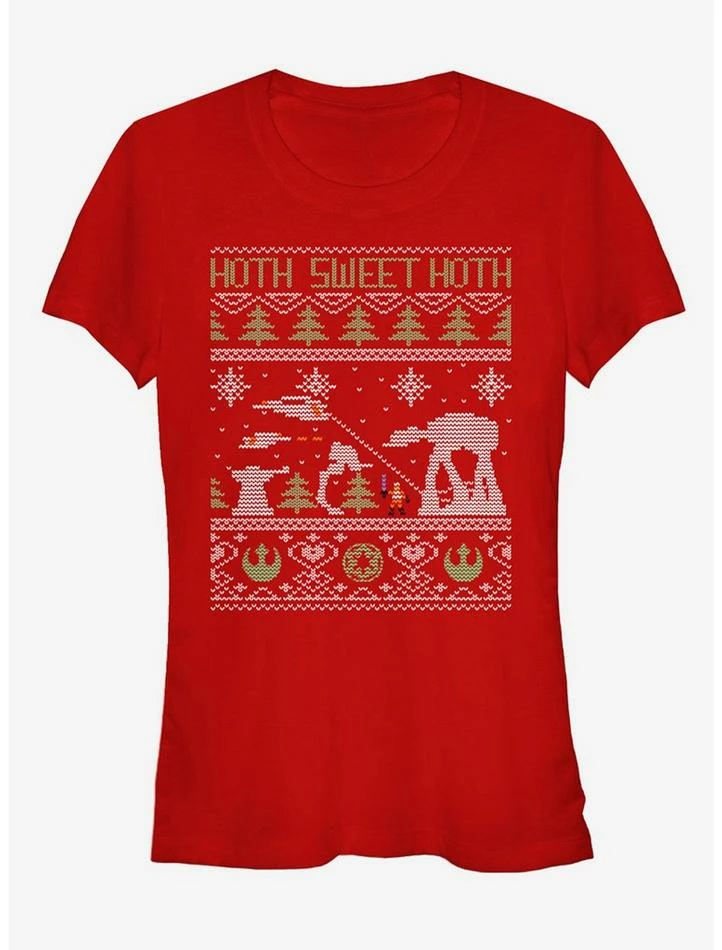 The weather on Hoth is frightful, but the fire and the Star Wars Hoth Sweet Hoth Ugly Christmas Sweater Red T-Shirt are so delightful! An AT-AT, Luke Skywalker, an AT-ST, and more come together to create an ugly Christmas sweater style print below the words “Hoth Sweet Hoth” on this awesome red Star Wars shirt. 100% Cotton.