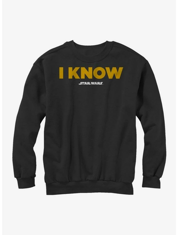 This black sweatshirt celebrates the now iconic interaction between Han Solo and Princess Leia that comes moments before Solo is frozen in carbonite. Ouch.