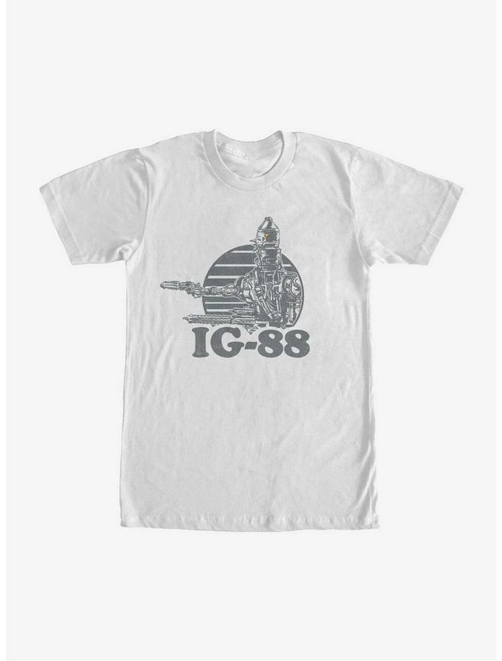Darth Vader assembled all of his most dangerous Bounty Hunters together to capture the Millennium Falcon and IG-88 is dying to get his bounty on the Star Wars IG-88 White T-Shirt. One of the most feared hunters in the galaxy, IG-88, is featured in a distressed black print on this white IG-88 shirt. 100% Cotton.