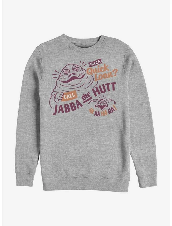 Need a quick loan? Call Jabba the Hutt! The iconic extraterrestrial slug — first seen in Star Wars: Episode VI – Return of the Jedi — appears on this heather grey crewneck sweatshirt alongside the always laughing Salacious Crumb.