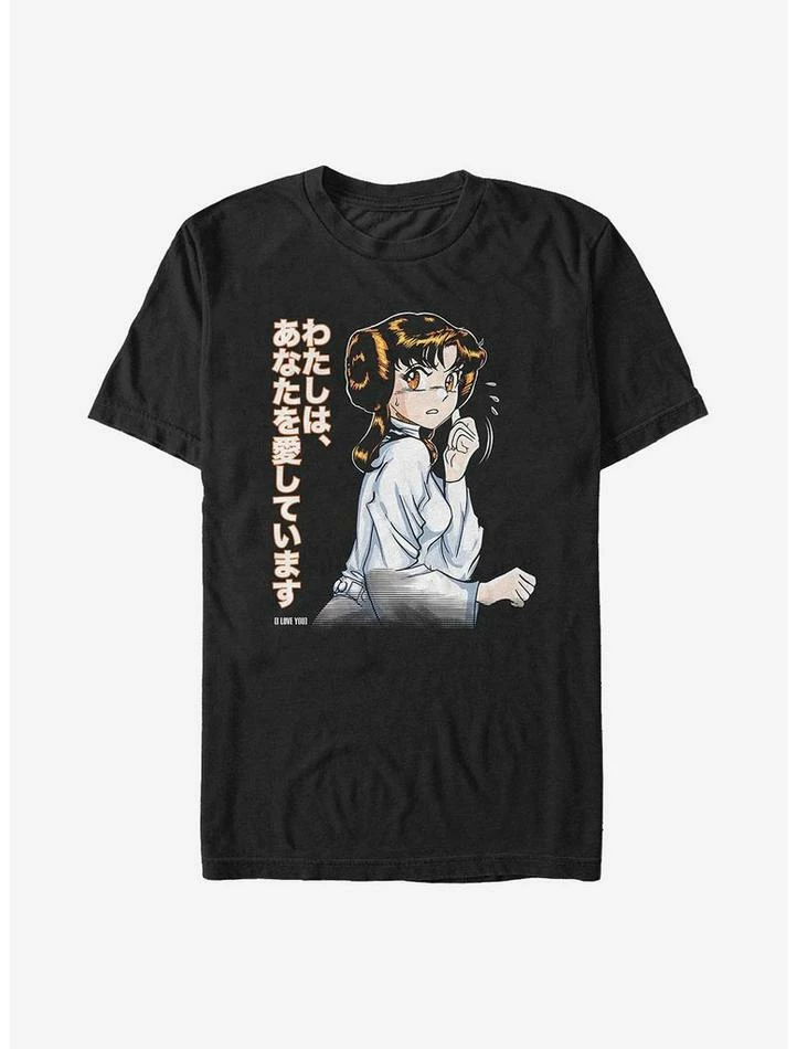 She may be kawaii — but she still kicks ass. This lightweight black Star Wars tee features an animated Princess Leia beside Japanese text.