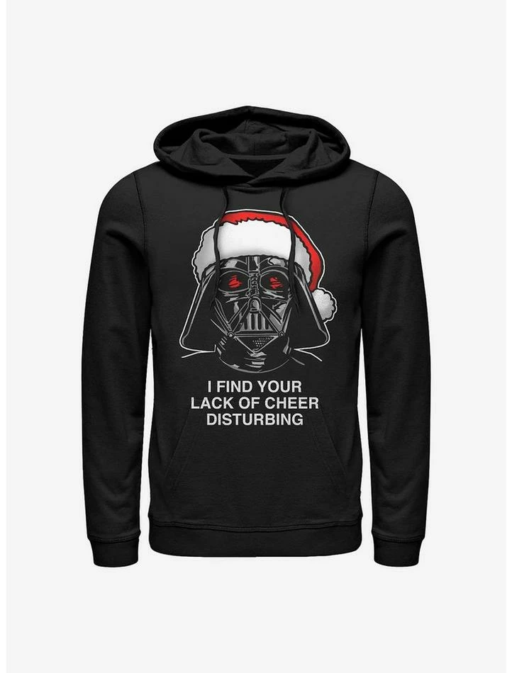 Darth Vader finds your lack of cheer disturbing. Grab this black pullover Star Wars holiday hoodie to prove him wrong. It features the iconic Sith Lord in a Santa hat.
