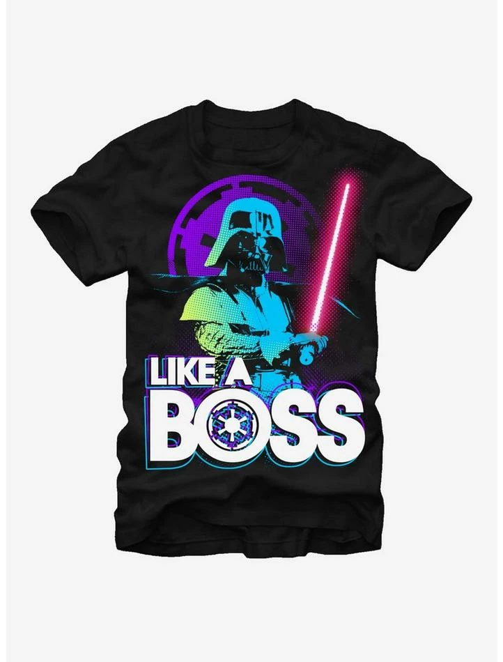 Darth Vader is a boss unlike any other and trust us, you do not want to disappoint him. “Like a boss” is printed on the Star Wars Like a Boss Black T-Shirt next to Darth Vader holding his lightsaber with the Empire symbol behind him. 100% Cotton.