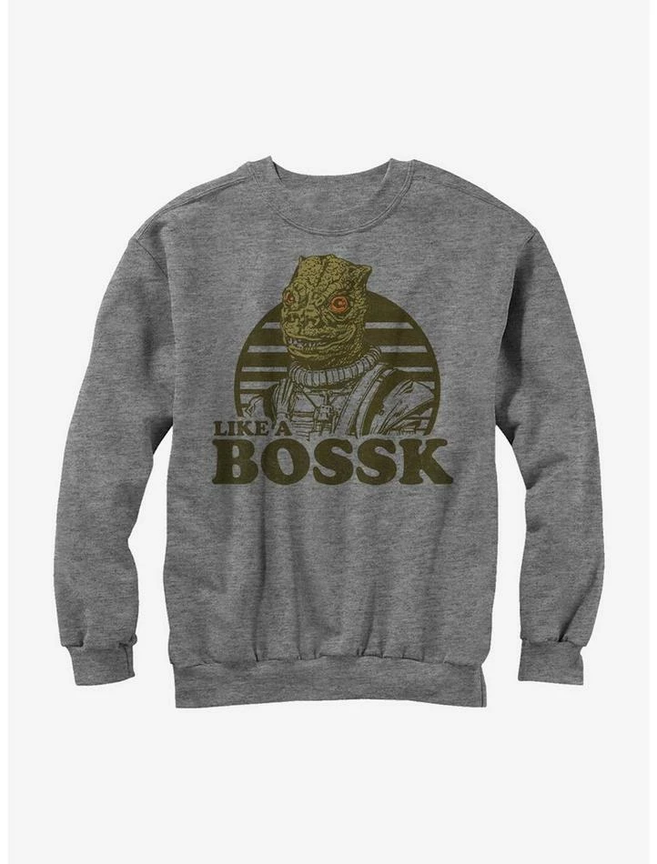 Chewbacca better watch out because the infamous Wookie hunter, Bossk, is here to wreak havoc with the Star Wars Like a Bossk Heather Gray Sweatshirt! One of Bobba Fett’s mentors, Bossk, is portrayed with the phrase “Like A Bossk” across this gray Bossk sweatshirt for a fun twist on the Bounty Hunter. 50% Cotton, 50% Polyester.