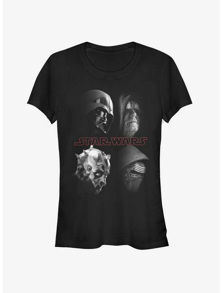 The Dark Side of style. This fitted black Star Wars tee features Darth Vader, Emperor Palpatine, Darth Maul and Kylo Ren.