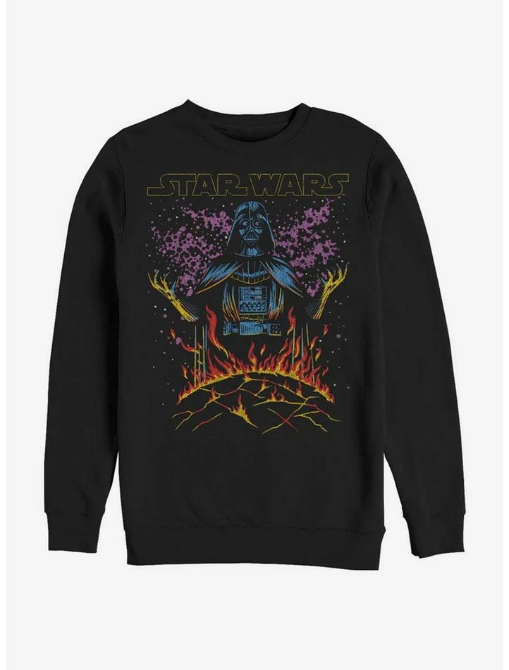 This black crewneckΒ Star Wars sweatshirt features Darth Vader hovering over a burning planet. A film logo sits above.
