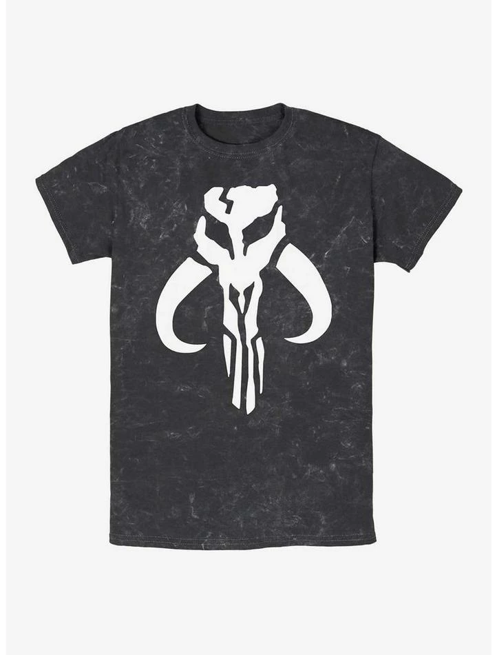 Behold, the Mythosaur skull! Rallying symbol of the Mandalorian people. That icon is boldly printed front and center on this black mineral washed Star Wars tee.