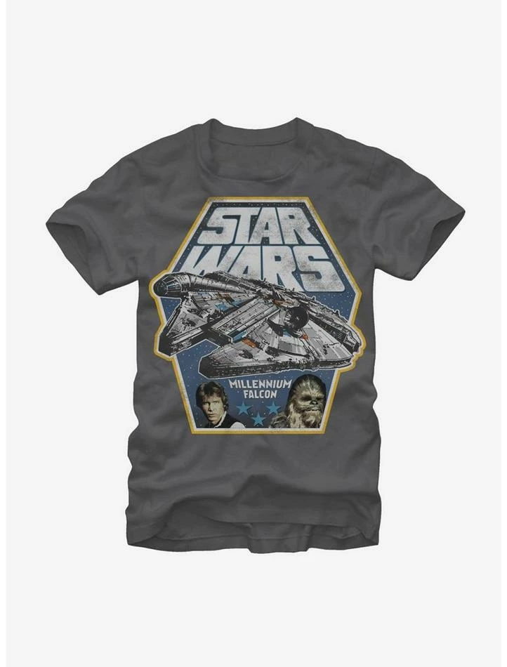 Need to make the Kessel Run in twelve parsecs? Not a problem for the Star Wars Millennium Falcon Crew Charcoal Gray T-Shirt! The infamous pilots/smugglers Han Solo and Chewbacca are featured in a distressed-style print with the Millennium Falcon and the Star Wars logo on this classic gray Star Wars shirt. 100% Cotton.