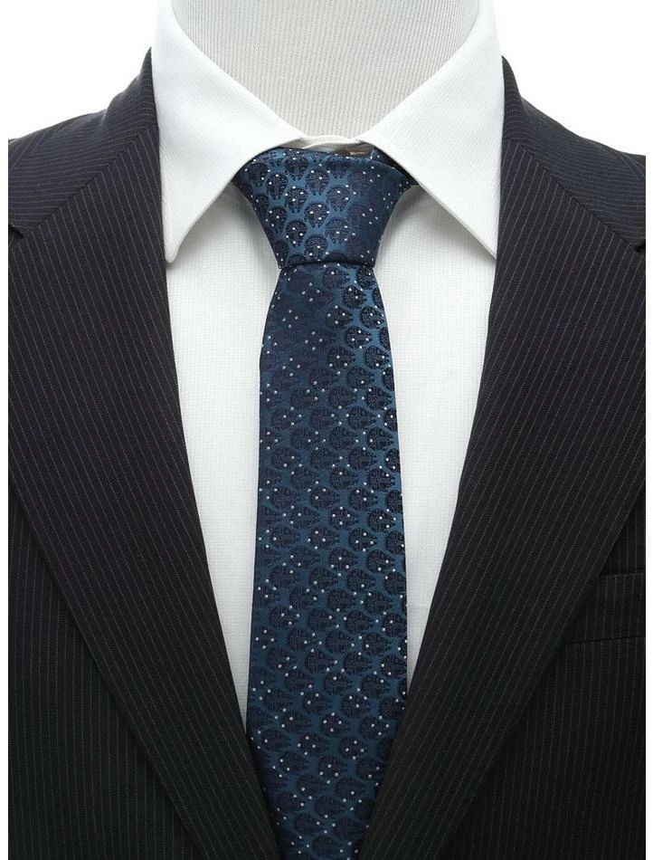 Iridescent teal and electric blue threads combine to form this elegant 100% silk tie. The Millennium Falcon darts across in neat rows, covered in a series of tiny silver dots reminiscent of all the stars in a galaxy far, far away. You’ve never seen a tie quite like this before. Officially licensed by Lucasfilm LTD. Approximately 59″ x 3″, 100% silk.