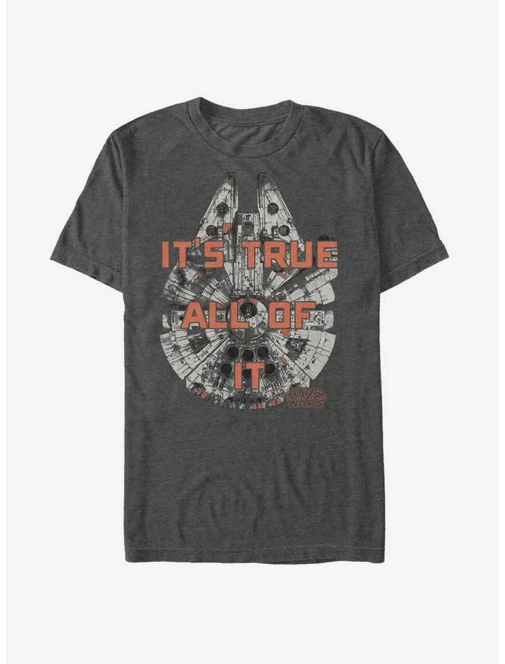 Reminisce about the adventures shared by Han, Luke, Leia, and Chewbacca with the Star Wars Millennium Falcon Han Solo It’s True Heather Charcoal T-Shirt. Han Solo’s quote “It’s True, All of It” is printed in a distressed style atop the Millennium Falcon on the front of this cool Star Wars Episode 7 shirt. 60% Cotton, 40% Polyester.
