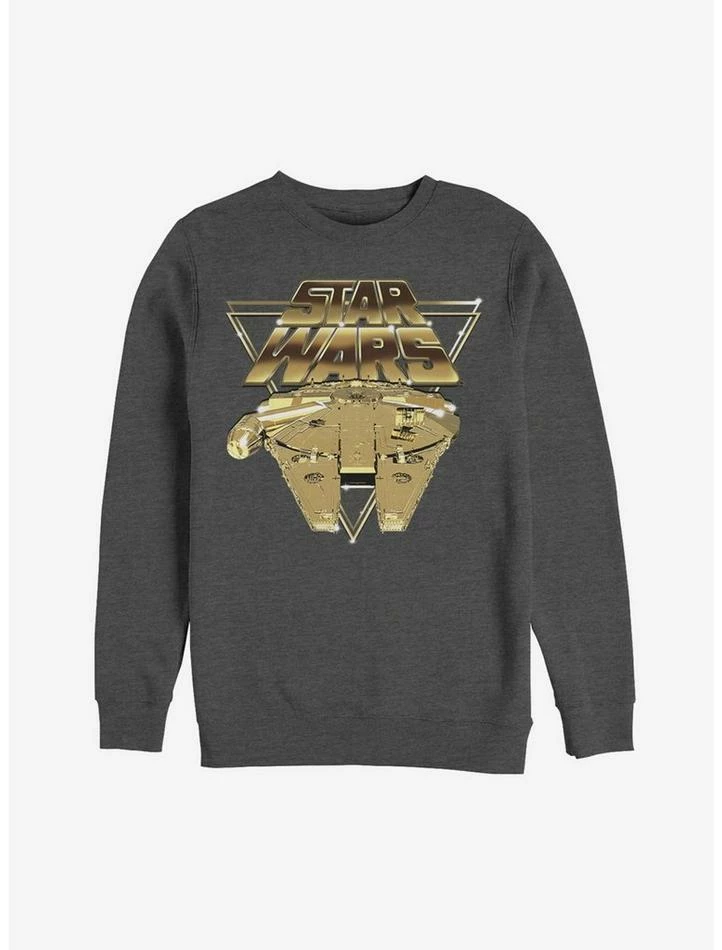 Next time you take the leap to hyperdrive, make sure you’ve got the Star Wars The Last Jedi Millennium Falcon Pixel Heather Charcoal Sweatshirt on your side! Han Solo’s beloved ship, the Millennium Falcon, flies on without him on this vintage gray Episode 8 sweatshirt that shows off the ship in a cool gold pixelated style. 50% Cotton, 50% Polyester.