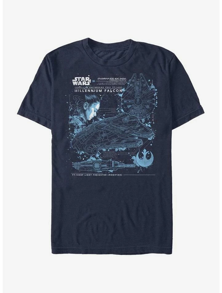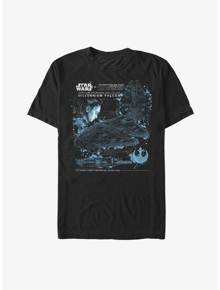 Rey was lucky enough to find the rusty old Millennium Falcon on Jakku just when she needed it the most! Her luck continues because she’s just found the Star Wars The Last Jedi Millennium Falcon Plans Black T-Shirt too! This epic black Episode 8 shirt shows detailed plans of the Millennium Falcon in blue, with a profile shot of Rey down the side. 100% Cotton.