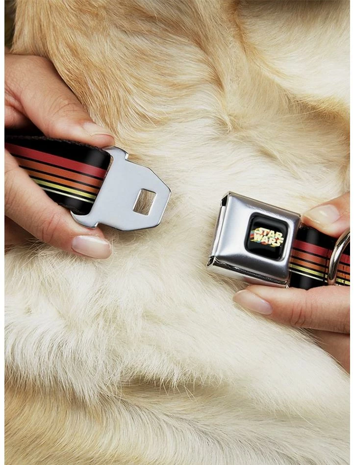 Your dog will be the talk of the town when people notice they’re wearing this awesome SeatBelt Dog Collar! Made from high-density polyester and durable steel components, this collar is built to last. It features beautiful vibrant artwork. The buckle is a miniature authentic SeatBelt Buckle, so you press the center button to release the clasp. This product is Made in USA by Buckle-Down, Inc. and is officially licensed by Star Wars.