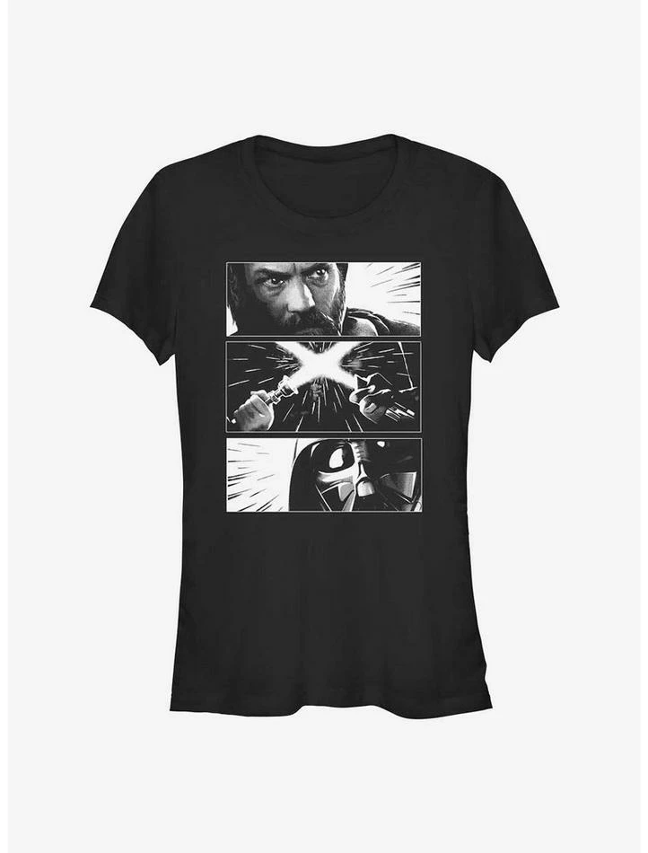 Thwack! Comic-inspired panels highlight an action-packed lightsaber battle between Obi-Wan Kenobi and Darth Vader on this fitted, lightweight black tee — inspired by the Disney+ series Star Wars: Obi-Wan Kenobi.