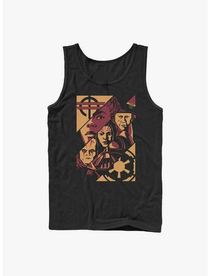 The Dark Side goes diagonal on this black tank top, inspired by the Disney+ series Star Wars: Obi-Wan Kenobi. Reva and the Inquisitors appear with Darth Vader in a slanting, fragmented design.