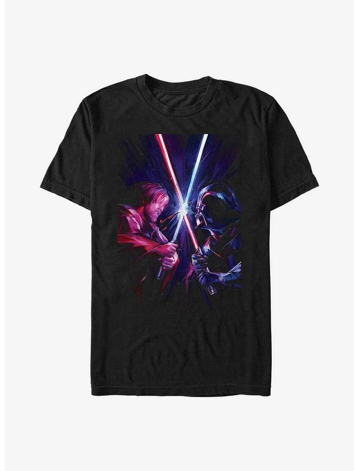 Β If this shirt could make a sound, that sound would definitely be clashing lightsabers. Our lightweight black tee — inspired by the seriesΒ Star Wars: Obi-Wan Kenobi — features the Jedi Master in a duel with Darth Vader.