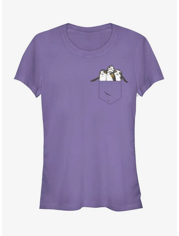 You can handle anything if you’ve got the cuteness of The Last Jedi Porgs In My Pocket Purple T-Shirt on your side! You’ll never be lonely again with these three adorable Porgs hanging out in a pocket print on this cute fitted purple Episode 8 shirt. 100% Cotton. Runs small, size up. Faux printed pocket.