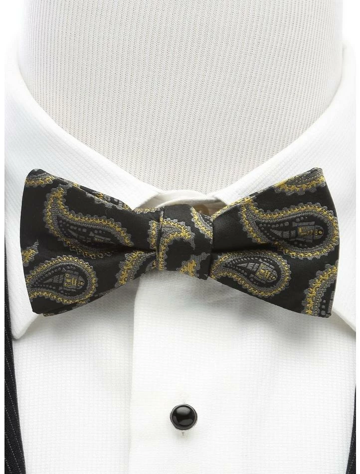 Fine gold and silver thread are interwoven against a space-black backdrop on this 100% silk bow tie. Featuring the likeness of everyone’s favorite droid R2D2, and set in a detailed paisley pattern, this fully-adjustable bow tie is sure to become your next favorite accessory. Officially licensed by Lucasfilm LTD. Approximately 4 3/4″ x 3″, 100% silk, pre-tied bow, adjustable neck size.