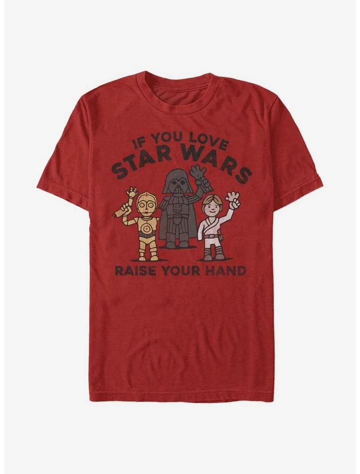 Love Star Wars? Raise your hand. Ooh… not like that, guys! This royal blue tee features C-3PO, Darth Vader and Luke Skywalker joining in the — uh — fun.