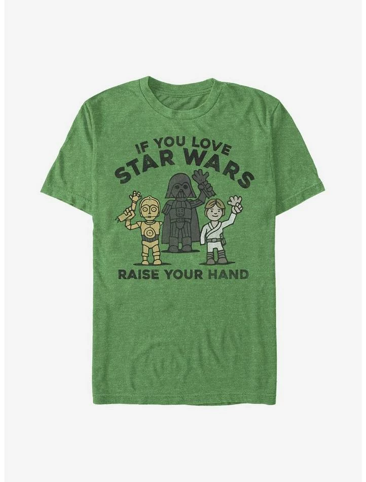 Love Star Wars? Raise your hand. Ooh… not like that, guys! This heather grey tee features C-3PO, Darth Vader and Luke Skywalker joining in the — uh — fun.