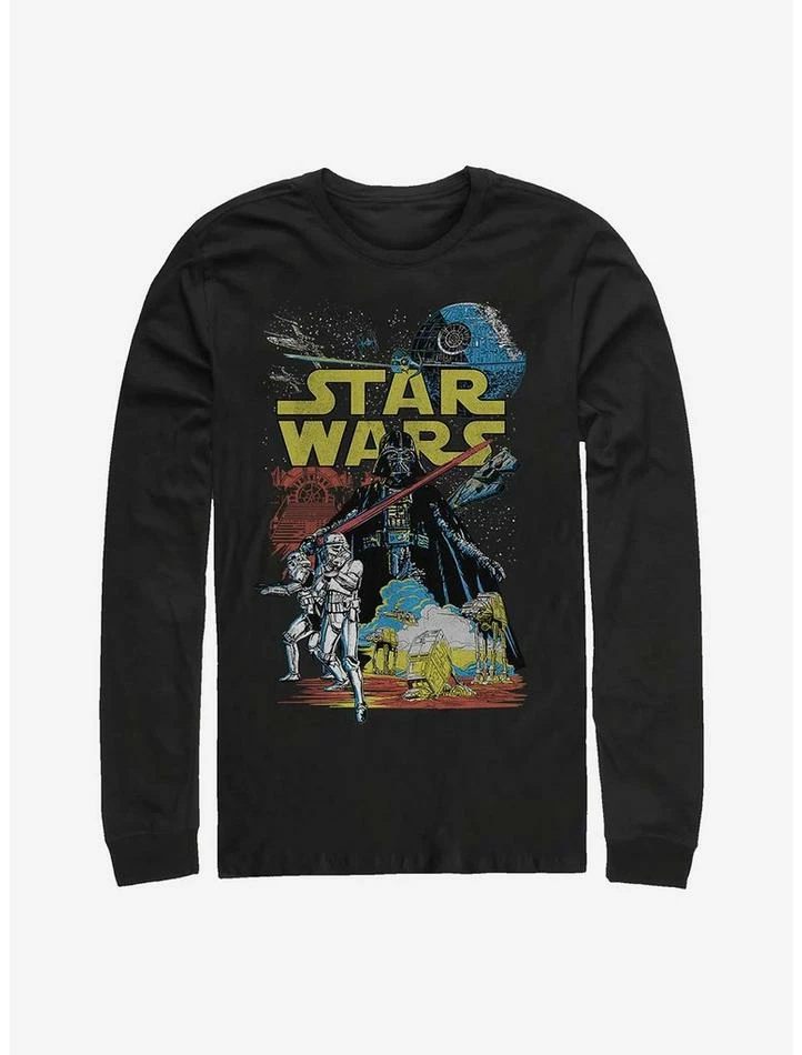 Stormtroopers, AT-AT walkers and Darth Vader — oh my! Classic Star Wars imagery, including the Death Star and Millennium Falcon, appears on this long-sleeved black graphic tee.