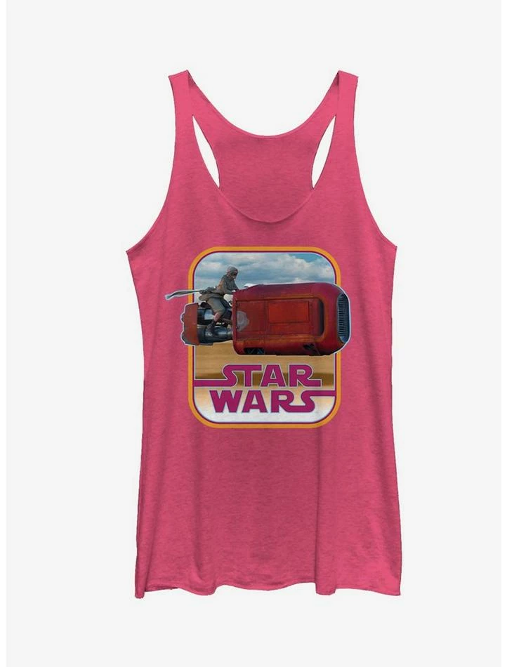 Take the desert planet of Jakku by storm with the Star Wars Retro Rey Speeder Heather Pink Racerback Tank Top! A vintage-style print on the front of this pink Star Wars Episode VII shirt features Rey on her speeder zooming above the Star Wars logo. 50% Polyester, 25% Cotton, 25% Rayon.
