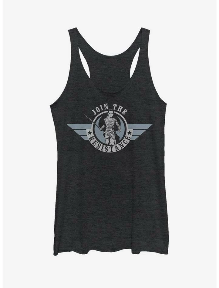 Leave Jakku behind for a future with the Force and the Star Wars Rey Join the Resistance Heather Black Racerback Tank Top. Rey runs with her staff next to the text “Join the Resistance” printed on the front of this awesome Star Wars Episode 7 Rey shirt. 50% Polyester, 25% Cotton, 25% Rayon. Designed with raw-edge hems.