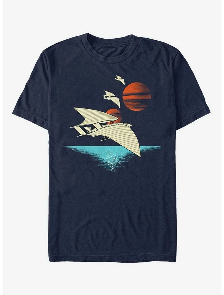 Take flight with the awesome Solo: A Star Wars Story Spacecraft Scene Men’s T-Shirt. A paper plane styled aircraft soars across the ocean, with red planets in the background, on this epic men’s Star Wars shirt.