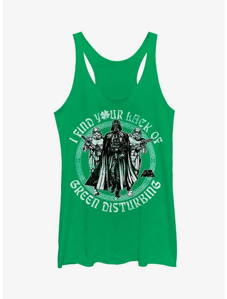 Disappoint Darth Vader and you’re going to need more than luck; you’ll need the Star Wars I Find Your Lack of Green Disturbing Women’s Racerback Tank Top! Vader and two stormtroopers patrol the front of this awesome tank with “I Find Your Lack of Green Disturbing” printed around them. Designed with raw-edge hems.