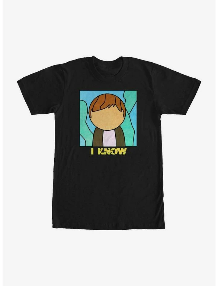 Immortalize the love of Han and Leia with the Star Wars Stained Glass Han I Know Black T-Shirt. A stained-glass-style image of Han Solo with his famous quote “I Know” from The Empire Strikes Back is printed on the front of this cool black Han Solo shirt. 100% Cotton.