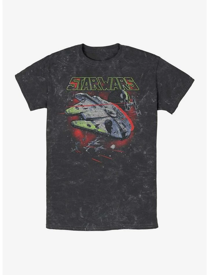 Pew-pew! The battle begins outside the Death Star on this black mineral washed Star Wars tee featuring the Millennium Falcon surrounded by TIE and X-wing fighters.
