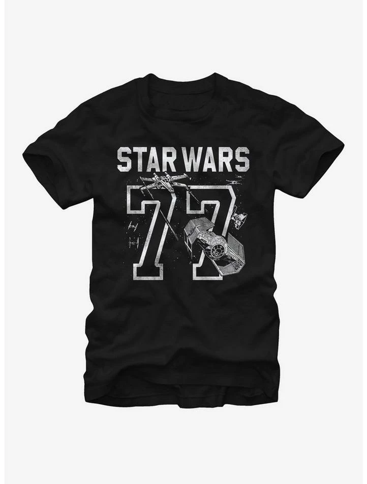 Show your allegiance to the Rebel Alliance’s team with the Star Wars 77 Athletic Print Black T-Shirt. “Star Wars” is printed above “77” with the scene of a X-wing starfighter battling a TIE Advanced x1 starfighter in space. 100% Cotton.