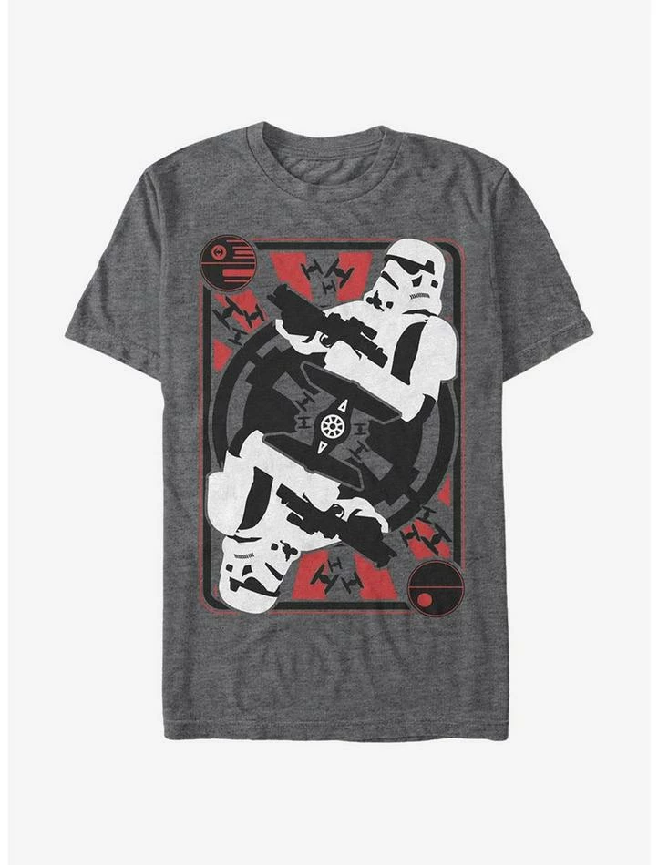 If you play your cards right, you won’t have to come up against the Star Wars Death Star Card Heather Charcoal T-Shirt alone in the dark! This gray Star Wars shirt features TIE Fighters, stormtroopers, and the Death Star in a playing card style. 60% Cotton, 40% Polyester.