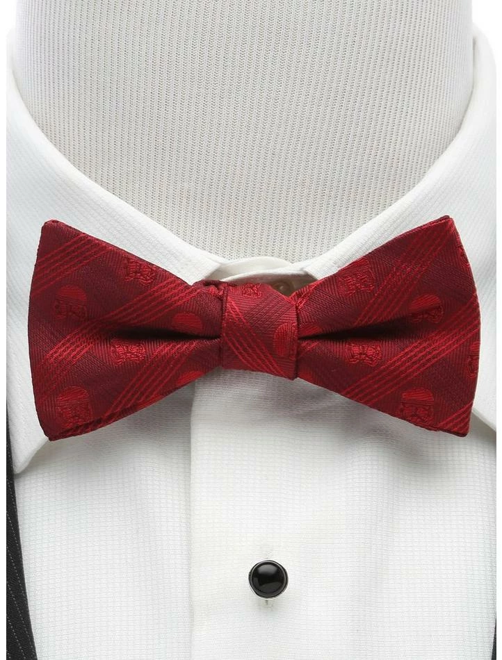 Show your allegiance to the First Order with this crimson red 100% silk bow tie. Featuring a series of red Sith Trooper helmets woven against a plaid-patterned background, this is the perfect new accessory to your formal wardrobe. Fully adjustable. Officially licensed by Lucasfilm LTD. Approximately 4 3/4″ x 3″, 100% silk, pre-tied bow, adjustable neck size.