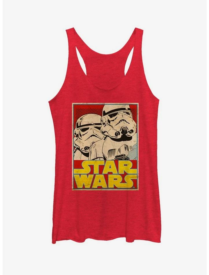 Take your look back to 1977 with the Star Wars Stormtrooper Trading Card Heather Red Racerback Tank Top! Two stormtroopers stand next to the Star Wars logo in a trading card-style print that gives this unique red Star Wars shirt a vintage look. 50% Polyester, 25% Cotton, 25% Rayon.