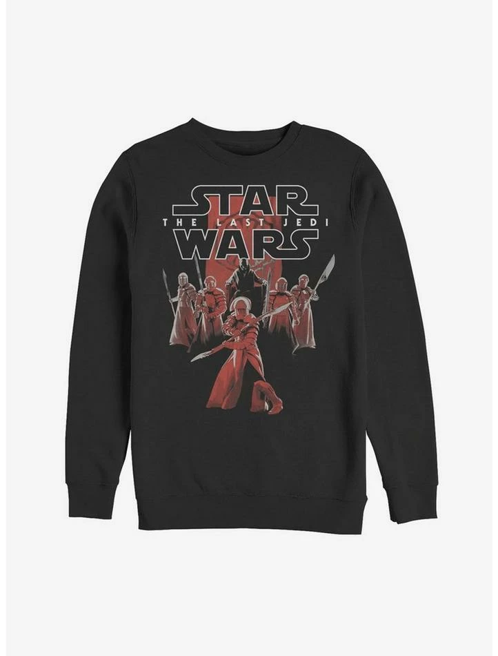 You’ll never get close to Supreme Leader Snoke with the Star Wars The Last Jedi Supreme Leader Snoke Black Sweatshirt protecting him! The terrifying Snoke is shown sitting on his throne while his red-clad Royal Guards protect him on this cool black Episode 8 sweatshirt. 50% Cotton, 50% Polyester.