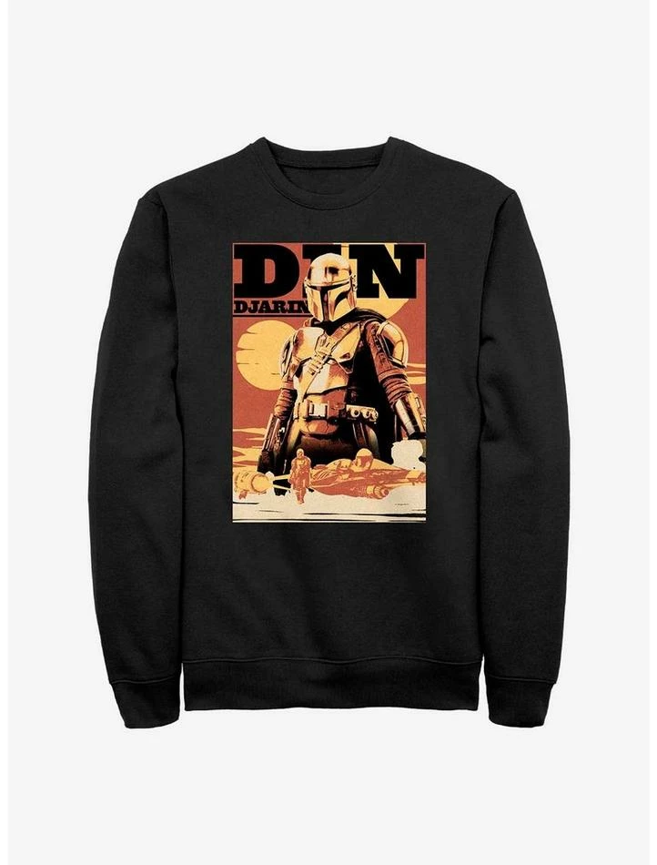 This is the way. Din Djarin appears before the two suns of Tatooine on this black crewneck sweatshirt inspired by the Disney+ series Star Wars: The Book of Boba Fett.