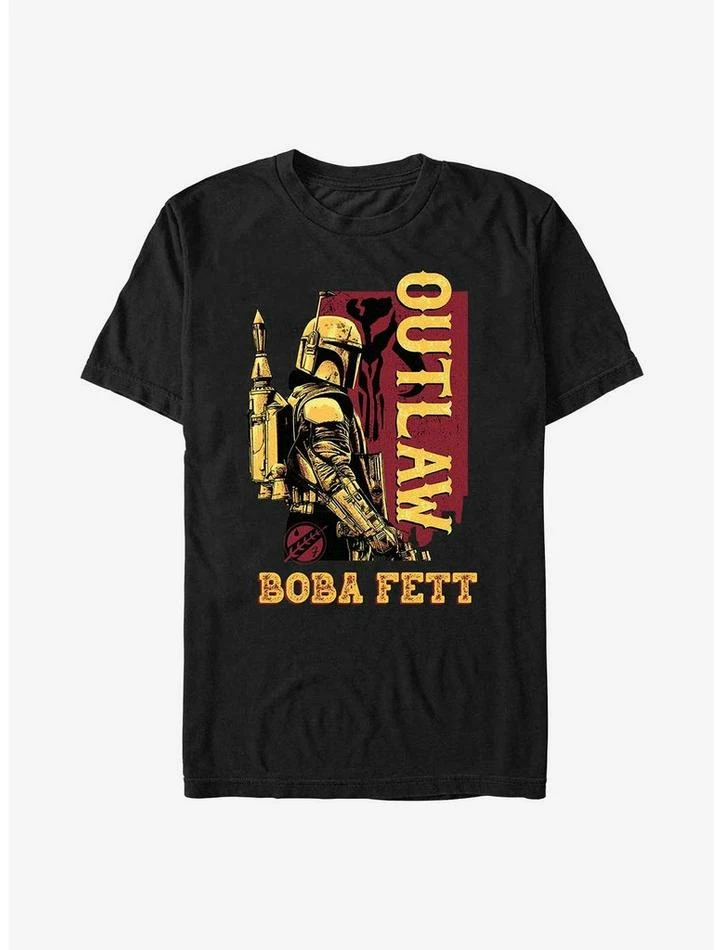 He’s an outlaw who’s out of this world. Boba Fett — Star Wars icon and title character of the Disney+ series The Book of Boba Fett — appears on the front of this lightweight black graphic tee.