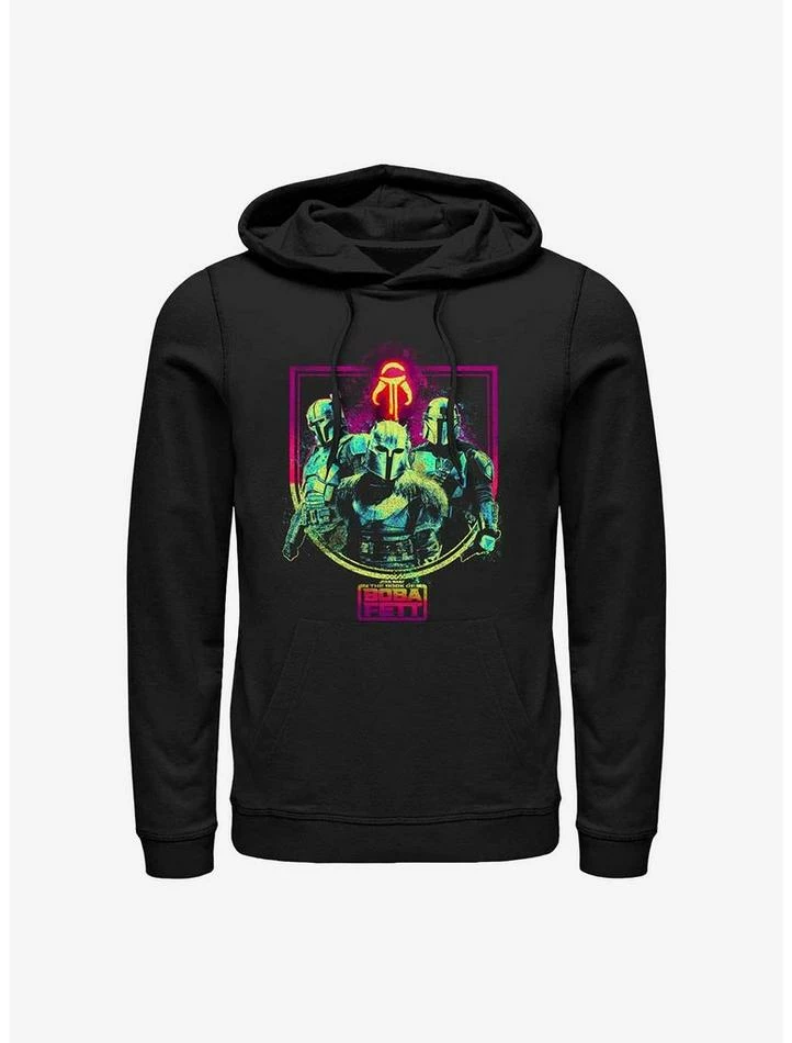 Hold onto your Darksaber! Our black pullover hoodie — inspired by Episode 5 of the Disney+ series Star Wars: The Book of Boba Fett — features remaining Mandalorian Guild members Paz Vizsla, The Armorer and Din Djarin, with a Mythosaur skull above and show logo below.