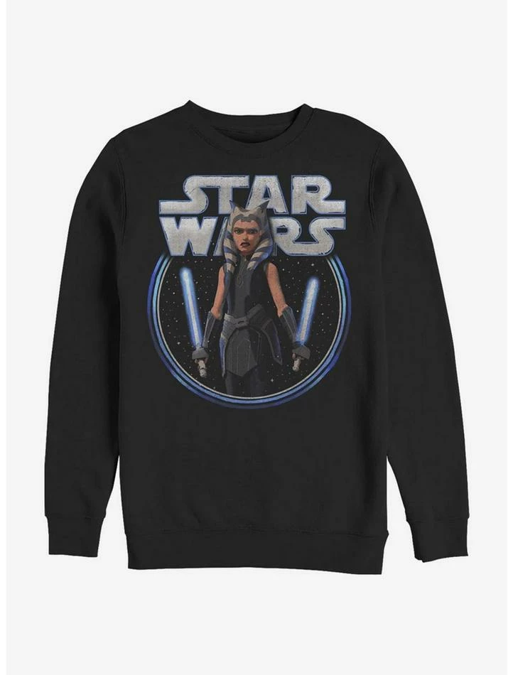 There she is! Fan-favorite Star Wars character Ahsoka Tano graces the front of this black crewneck sweatshirt.