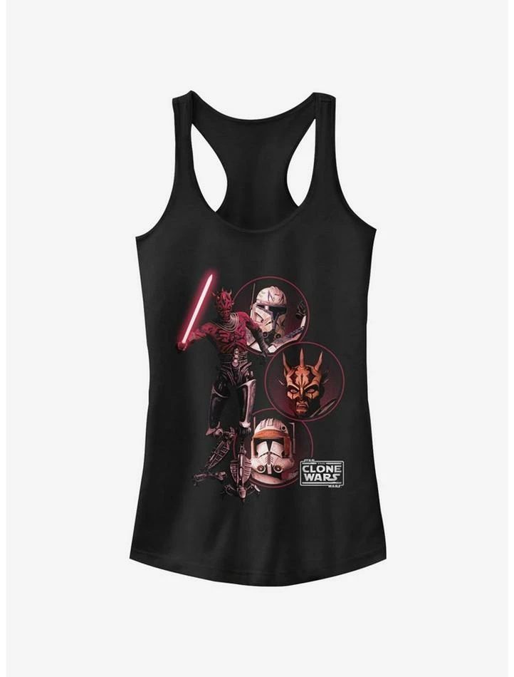 The Dark Side of Star Wars animation meets a couple of Clones. This black racerback tank features Maul and Savage Opress — with Captain Rex and Commander Cody.