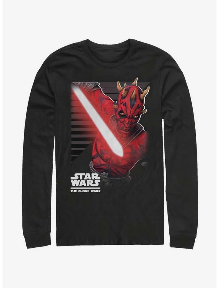 The iconic red blade. This long-sleeved black tee — inspired by Star Wars: The Clone Wars — features Maul holding his lightsaber.