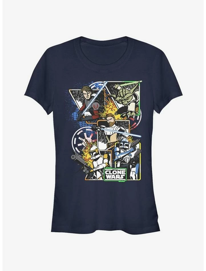 Your favorite Clone Wars characters in action! This fitted navy blue Star Wars tee features Anakin Skywalker, Yoda, Obi-Wan Kenobi, Commander Cody and Captain Rex.
